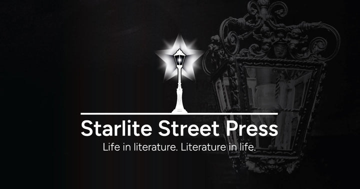 White short-sleeve cotton crew neck t-shirt with embroidered Starlite Street Press logo on the left chest.